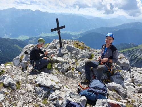 Ve čtvrtek ráno nám počasí opravdu přálo, slunce jako z pohlednice a nebe bez mráčku. Cesta k nástupům byla tak akorát, zhruba 400 výškových metrů. A tak jsme se do hodinky už vázali na lana a nastupovali do cest. Celá naše skupina se přiměřeně rozprostřela po celé jihozápadně stěně Kalblingu (2 196 mnm) a začali jsme stoupat k vrcholu. Cesty byly krásné, v těžších úsecích odjištěné a celkově byli všichni s prvním lezeckým dnem spokojení. Odpoledne jsme si mohli vychutnat krásný výhled z vrcholu kopce, až do Národního parku Gesäuse. Večer se opět nesl v duchu společného veselí.