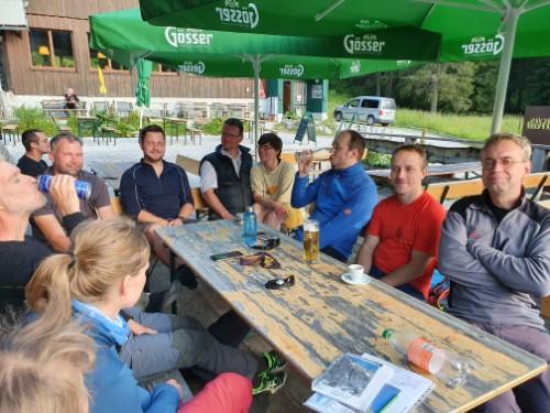 V sobotu ráno bylo pěkně pošmourno. Vyčkávali jsme, až vítr osuší mokré kouty a až odlezou pár délek všichni nadšenci rakouští lezci, co přijeli ráno auty na parkoviště k chatě. Vyrazili jsme tedy později a vyplatilo se. Odpoledne se nebe vyjasnilo a slunce nám zahřálo studená těla a zkřehlé prsty. Po večeři jsme si dali společný přípitek na vydařenou akci, dojedli a dopili jsme zbytky a zakončili den, jak jinak než společným posezením.