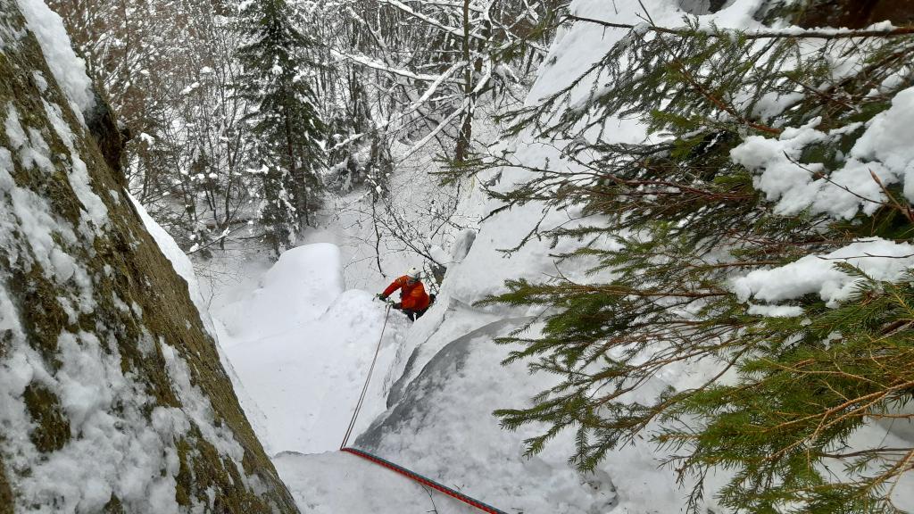 Nad zatáčkou je dobře vyledněný nejdelší ledopád a nad ním v koutě po pravé ruce je přístupný slaňovací kruh, nebo po levé ruce mohutný pařez se starou smyčkou. Ze dvou strmých stupňů ve svahu vlevo od něj je zaledněný jen horní. Spodní stupeň je pouze zasněžená kamenná plotna, po které lze lézt pouze pomocí padlého stromu stylem drytooling. Nad silnicí je už částečně narostlý hlavní led v roklině. Dostatek ledu je na cvičné položené stěnce u silnice vpravo vedle rokliny.