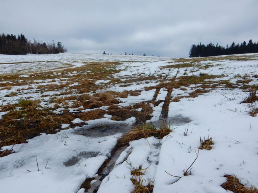Během stoupání na Kutnou (996 m) se sníh zase objeví. Rýchorskou necháme ji po pravé ruce.
