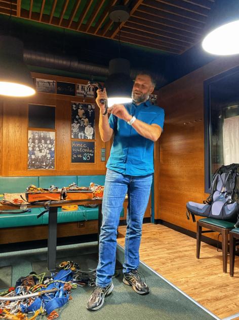 Po krátké pauze na vydechnutí a objednání dalšího pivka, pokračujeme dále. Na řadě jsou specifičtější druhy materiálu: Všichni přítomní napjatě poslouchají výklad o různých druzích maček, o cepínech, šroubech do ledu, blokantech, kladkách.. Kromě zaujatých výrazů nováčků, vypadá stejně ohromeně i místní kuchař, který pozoruje Happyho skrz sklo z kuchyně.