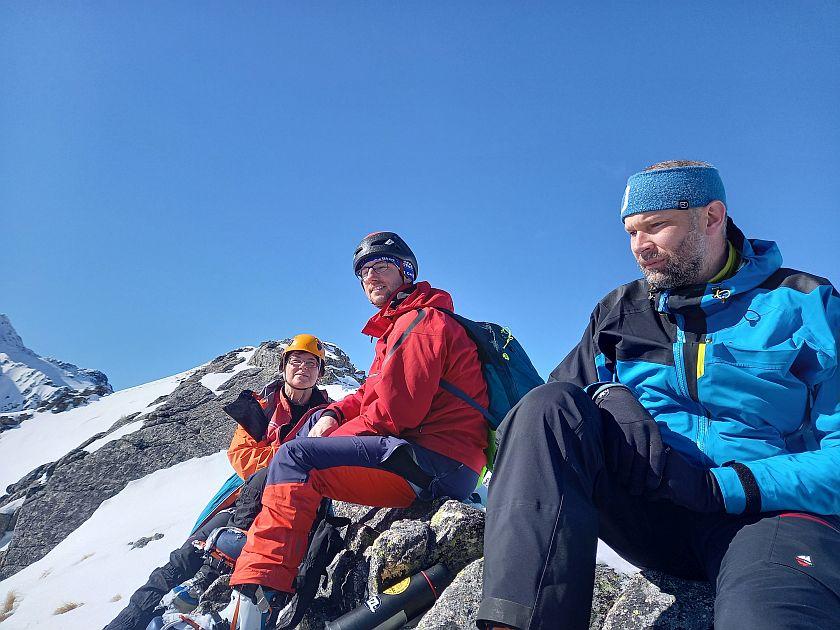 Horolezeckou vlajku na stožáru vztyčili jen Radim s Tomášem Ch. "Splnili jsme všechno, co jsme chtěli - vylezli jsme skalní čtyřku Szczepaňské, vybušili ledy do Malé Ledové doliny, zdolali Baraní rohy a pořádně si zalyžovali v prašanu," spokojeně prohlásil Tomáš.
