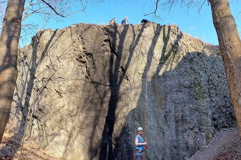 V sobotu jsme se sešli pod pravou plotnou v pražských Hlubočepích, někdo přijel autobusem a někdo si užil cestu motoráčkem pražským semeringem, čekaly nás dva krásné slunné dny. Nacvičovali jsme základy záchranářských technik, a to od/blokování jistítek, reverza, půlloďáku, následně jsme pokročili k "vyšším dívčím" technikám, jako je kamarádská dopomoc, Hoi, Strauss, spouštění na svázaných lanech a slanění se zraněným. Nácvik Straussova vytažení protiváhou s využitím otevřené gardy byl zábavný zvláště u Lucky a Ivoše, který jako raněný váží o půlku víc než Lucka. Lucce nestály vlasy hrůzou na hlavě, nene, to musela vytahovat Ivoše hlavou dolů k velkému pobavení okolních družstev. Konečně jsme si mohli pohodlně přečíst její nápis na triku vzhůru nohama. Petra to měla při vytahování TomaK trochu jednodušší.