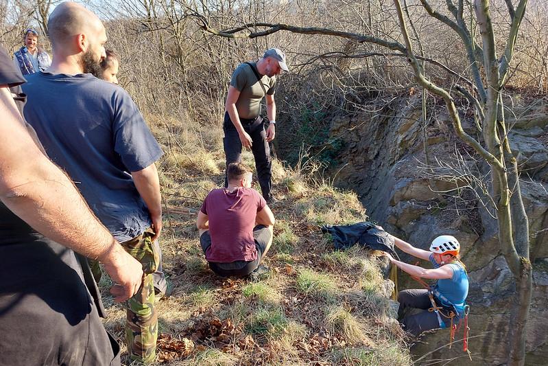 V sobotu jsme se sešli pod pravou plotnou v pražských Hlubočepích, někdo přijel autobusem a někdo si užil cestu motoráčkem pražským semeringem, čekaly nás dva krásné slunné dny. Nacvičovali jsme základy záchranářských technik, a to od/blokování jistítek, reverza, půlloďáku, následně jsme pokročili k "vyšším dívčím" technikám, jako je kamarádská dopomoc, Hoi, Strauss, spouštění na svázaných lanech a slanění se zraněným. Nácvik Straussova vytažení protiváhou s využitím otevřené gardy byl zábavný zvláště u Lucky a Ivoše, který jako raněný váží o půlku víc než Lucka. Lucce nestály vlasy hrůzou na hlavě, nene, to musela vytahovat Ivoše hlavou dolů k velkému pobavení okolních družstev. Konečně jsme si mohli pohodlně přečíst její nápis na triku vzhůru nohama. Petra to měla při vytahování TomaK trochu jednodušší.