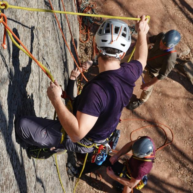 Než slanil zbytek družstva, Ivoš s Jančou se snažili zjistit Jakubův zdravotní stav a trochu ho zahřát, ne úplně šikovně, ale aspoň trochu. Když už byli pod borovicí, kde ležel Kuba, skoro všichni, vynořil se odnikud Dano, který byl trochu ponechán svému osudu. Také chyba. Neřekli jsme si nahoře plán B, když Kubu nenajde. Po delších přípravách slanil Dano s dalším lanem na polici níže připravit štand. Pustil se do toho s patřičnou dávkou železa. Za ním slanila Lucka, která připravila pohodlnější štand kolem kmene stromu a chystali poslední délku slanění. Přispěchal tam i Tomáš, který na štandu zůstal, zatímco Lucka s Danem už jeli až pod skálu.