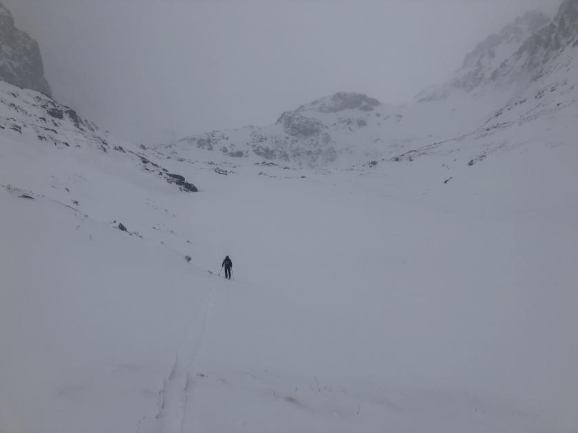 Dostáváme se pod Polský hrebeň. Vítr i sněžení ustalo, už poletuje semtam vločka. Vidíme hřeben, dohadujeme se, kudy nahoru (oba jsme tu byli jen v létě...). Chvíli kličkujeme svahem, je tu tak 15 cm nového sněhu. Při výstupové otočce se občas odlomí roh desky... Ale svah má pod 30°, tak šlapeme dál. Na pilíři uvidíme řetězy, cesta k nim je už nad 30°sklonu, ale k řetězu dorážíme v pohodě. Mezitím opět začíná sněžit a hřeben nad námi hučet. Vyškrábeme se nahoru a do obličeje nám tisíci bodlinkami vane severák. Jsme na hřebeni, je jedenáct hodin, teploměr ukazuje -9°C, pocitově tak -20°. Kotel pod námi je vidět vcelku pěkně, ale cesta dolů na sjezd není, takže pokračujeme s mačkami a cepínem. Scházíme k rozcestníku v Zamrznutom kotli. Zde je vítr mírnější, tak dáváme svačinu. Ale ejhle, během deseti minut kotel mizí v bílém mléku. Nu což, zapínám na hodinkách navigaci po trase, kterou jsem si pro jistotu doma připravil pro tyto příležitosti. I z paměti vím, že cesta teď traverzuje pod Prielom, není se kde ztratit...