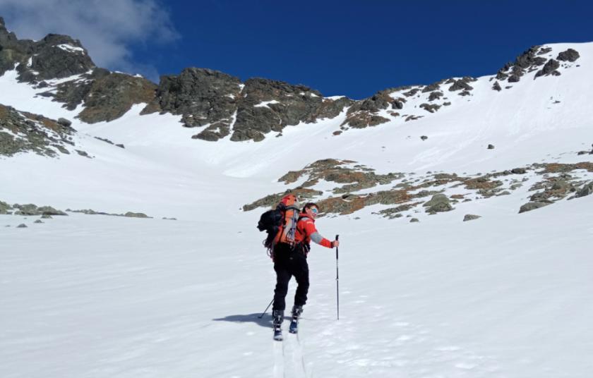 Okolo Dlhého plesa dojdeme na konec Velické doliny. Lyže znovu připínáme na batohy, do ruky bereme cepín a lezeme strmým sněhem a pak podél řetězů na Poľský hrebeň (2200 m).