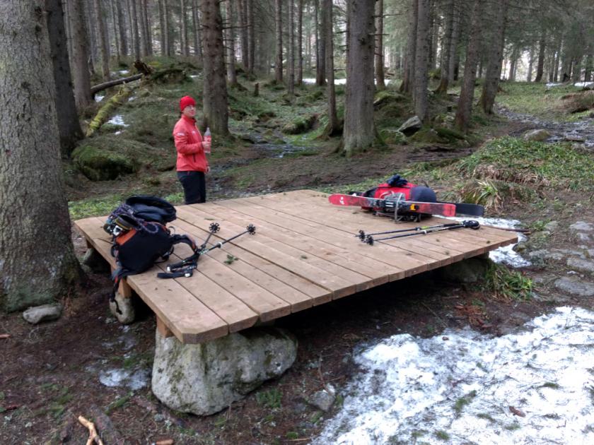 Pěšky musíme dojít jen zhruba poslední kilometr na horolezecké táborisko na polaně Pod Vysokou. Oheň, buřty, bivak na připravených dřevěných podlážkách.