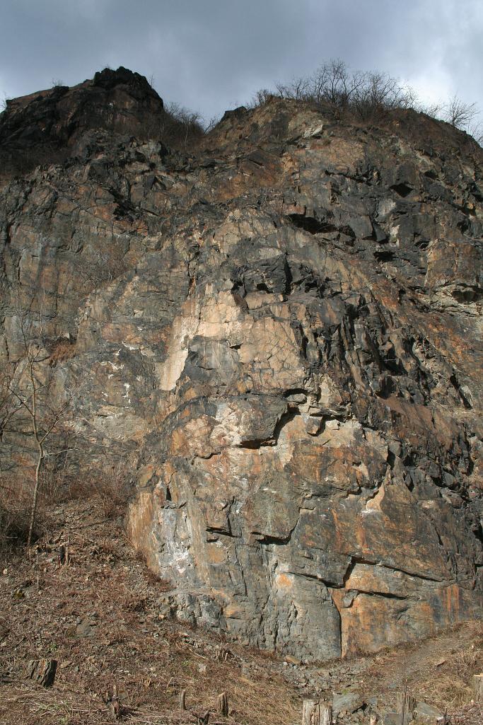 Dole u železnice. Kolmá těžká stěna a lehčí hrany od 2+ do 9 UIAA.