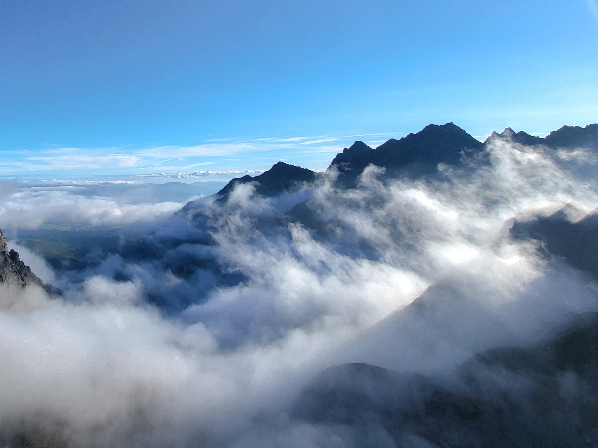 Druhý den máme alpinistický budíček v půl čtvrté ráno, protože někdo vymyslel, že zkusíme přelézt hřebenovku koruny Vysoké. Jedná se kombinaci Dračích štítů, vrcholů Vysoké a Ťažkého štítu, které z dálky tvoří krásnou siluetu koruny. Ještě za tmy procházíme Zlomiskovou dolinou a za svítání jsme u Ošarpanců. Jedna idea byla začít rovnou traverzem Ošarpanců, ale vzhledem k tomu, že netušíme, jak dlouho nám to celé může trvat a celkově moc informací nemáme, tak rozhodujeme šetřit čas a na hřeben nastupujeme až za Velkým Ošarpancem. Jednoduchým terénem systémem polic a žlábků se za chvíli dostaneme na hřeben, odkud už průběžně na laně lezeme JV hřeben na Dračí štít (cca 3/3+ uiaa). Skála je celkem rozjebaná s množstvím volných kamenů. Netrvá to dlouho a v duchu neustále přemýšlím, proč jsme nemohli zůstat na Volie veže nebo v nějaké jiné pevné stěně s vrtanými štandy. Nějakým zázrakem jsme nic neshodili a místy to bylo i hezké lezení s pořádnou dávkou expozice. S touto sladce-nahořklou chutí dolézáme na vrchol Dračího štítu, odkud slaňujeme do Vyšného Dračího sedla. Podcházíme Malý Dračí štít, kam lze taky vylézt, a sólo jednoduchým terénem vylézáme na JV vrchol Vysoké. Odtamtud slaňujeme do normálky do centrálního žlabu, což se zpětně ukazuje jako nešťastný nápad. Zvlášť když to je možné celkem dobře sejít pěšky. Při stahování lana se lano zasekává ve spáře na polici za převisem. Zkoušíme všemi možnými i nemožnými způsoby lano vyzvonit, ale neúspěšně. Nakonec s druhým lanem nalézám do stěny a lano vysvobozuji. Nejsem však schopný se pak dostat stejným způsobem dolů. Po chvíli přemýšlení si obhozem lana za vzdálený hrot dělám jištění a traverzem plotnou se vysvobozuji. Kolik času jsme zde ztratili je lepší nevědět. Normálkou pak dolézáme na SZ vrchol Vysoké. Z ranního azura se během dne dělá silná oblačnost a směr naší další cesty je ponořen v ponuré mlze. Což celkem dobře koresponduje s naší náladou a odhodlaností. Vidíme jen siluetu ostrého hřebene, který bychom měli nějak slézt dolů. Nikdo se do vedení nehrne a tak po chvíli přemýšlení se uchylujeme k plánu B - dostat se nejkratší možnou trasou na Chatu pod Rysmi na halušky a na pivo. Korunu se zbývajícím Ťažkým štítem budeme muset dokončit někdy příště.