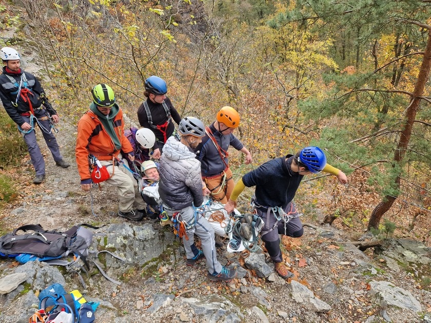 Slaníme jednu délku a vidíme, že s Kubou je jeho syn Mates, oba silně podchlazení, vyčerpání, dehydrovaní, ale zajištění proti pádu. Mates příliš nereaguje, je ztuhlý a komunikace vázne. Kuba reaguje až příliš, žvaní nesmysly, má potřebu se angažovat a podaný čaj zvrací. Profi záchranka o nás již ví, ale letová situace neumožňuje start vrtulníku a máme za úkol dostat postižené na silnici, kde je nabere sanitka. Není čas ztrácet čas, jeden záchranář pokračuje dál a staví sestupovou cestu. Zadání úkolu a náhoda tomu chtěla, že je třeba udělat další štand a bude nutné s postiženými přesedat. Na štandu je připraven záchranář a sestup s prokřehlými horolezci může začít. Nejdřív jede mumlající Mates, ve společném závěsu na zádech dorazí na postupový štand, kde se to lehce zadrhne, ale podaří se zmrzlíka předat a dojet s ním až dolů. Nosítkáři jsou ready, zabalí jej do termofolie, začnou se zahřívání a vázáním do nosítek. Ještě nám na polici zůstal Kuba, toho je trochu větší kousek a tak musí nastoupit záchranář jak hora, aby s ním sjel ke štandu. Tam na něj naopak může čekat nejkřehčí záchranářka dnešní akce, jelikož předání, již visícího Kuby je snadné. Ale ouha, cesta dolů s Kubou způsobí kamenou lavinu a je tedy nutné odnést Matěje do bezpečí, nosítkáři a část záchranářů čapnou improvizovaná nosítka a díky vyvázané cestě, je možno transportovat nešťastníka v horizontální poloze až na silnici. Kuba zatím dojede dolů, je zahříván, uvázán a připraven k transportu. Gravitace nám opět vysvětlí, že rozdíl otce a syna není pouze v letech a s druhým nezvedencem se tým pronese o něco více.