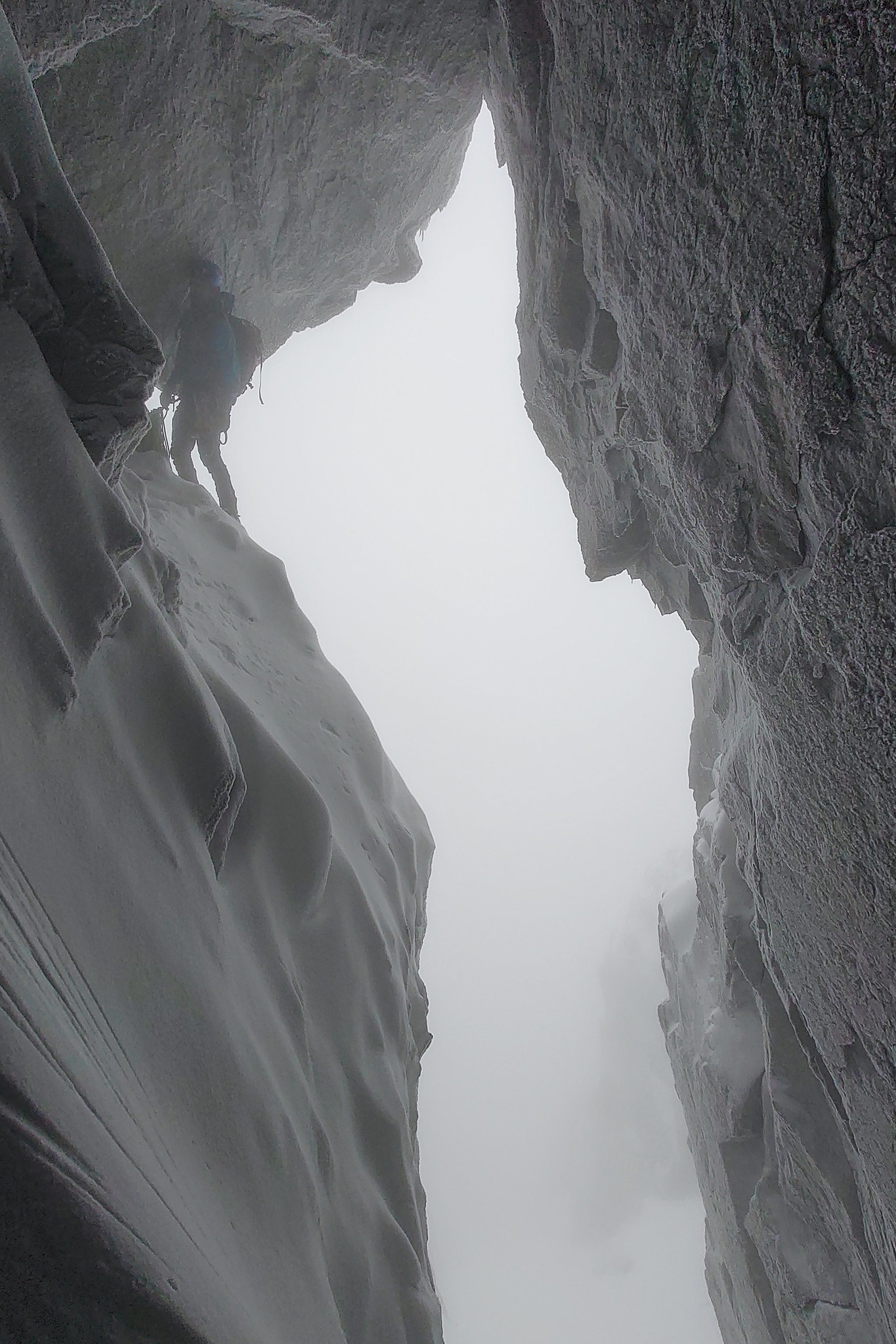 Reálně leze půl hodiny první délku každý prvolezec. Vždy, když se uvolní kámen nebo vyjede cepín, ozve se zavřísknutí. Rozbitá a zasněžená skála na větru a ve stínu, v kombinaci s nejasně vedeným traverzem budí strach u každého horolezce. Asi jsme netrefili trasu úplně správně a obtížnost odhadujeme na trojku.