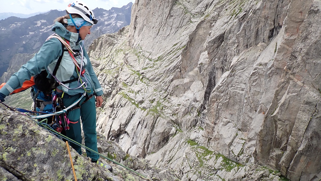 Další den ráno se mě a Denči ujal Happy, aby omrknul, jestli nás v průběhu nováčkovské školy všechno dobře naučil, a ujistil se, že se ve skále nebudeme chovat jako telata. Hodinu a půl jsme mířili vzhůru k nástupu na Piz Badile a poté začali stoupat zhruba 17 délkovou cestou. I přes pomalejší tempo při stavění štandů jsme kolem 16. hodiny dosáhli vrcholu (cca 3200mnm). Výhled byl parádní, byli jsme šťastní, že jsme to stihli. Na slaňování jsme spojili síly s další trojící a za jemného deštíku dorazili zpět do chaty.