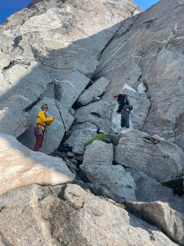 Další den ráno se mě a Denči ujal Happy, aby omrknul, jestli nás v průběhu nováčkovské školy všechno dobře naučil, a ujistil se, že se ve skále nebudeme chovat jako telata. Hodinu a půl jsme mířili vzhůru k nástupu na Piz Badile a poté začali stoupat zhruba 17 délkovou cestou. I přes pomalejší tempo při stavění štandů jsme kolem 16. hodiny dosáhli vrcholu (cca 3200mnm). Výhled byl parádní, byli jsme šťastní, že jsme to stihli. Na slaňování jsme spojili síly s další trojící a za jemného deštíku dorazili zpět do chaty.