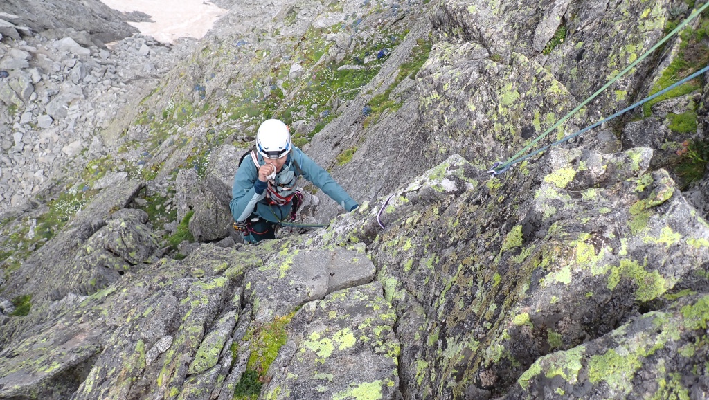 Další den ráno se mě a Denči ujal Happy, aby omrknul, jestli nás v průběhu nováčkovské školy všechno dobře naučil, a ujistil se, že se ve skále nebudeme chovat jako telata. Hodinu a půl jsme mířili vzhůru k nástupu na Piz Badile a poté začali stoupat zhruba 17 délkovou cestou. I přes pomalejší tempo při stavění štandů jsme kolem 16. hodiny dosáhli vrcholu (cca 3200mnm). Výhled byl parádní, byli jsme šťastní, že jsme to stihli. Na slaňování jsme spojili síly s další trojící a za jemného deštíku dorazili zpět do chaty.