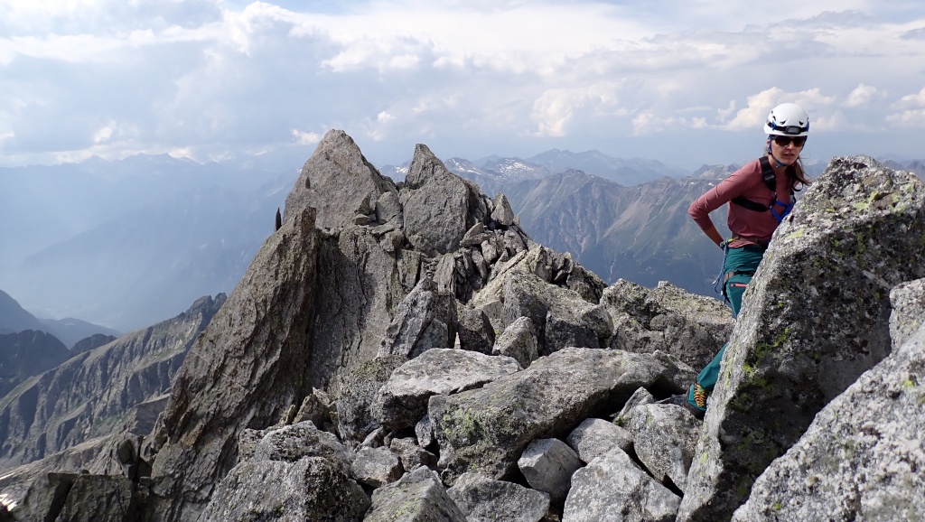 Happy přebírá vedení a maže vzhůru lehkým a dobře zajištěným žlabem poslední dvě délky. Kuba odkládá batoh a žene se za ním. 17. délka se jde pěšky se sbalenými lany k vrcholovému aluminiovému jehlanu. Kuba přichází jako poslední dvě minuty před čtvrtou hodinou.