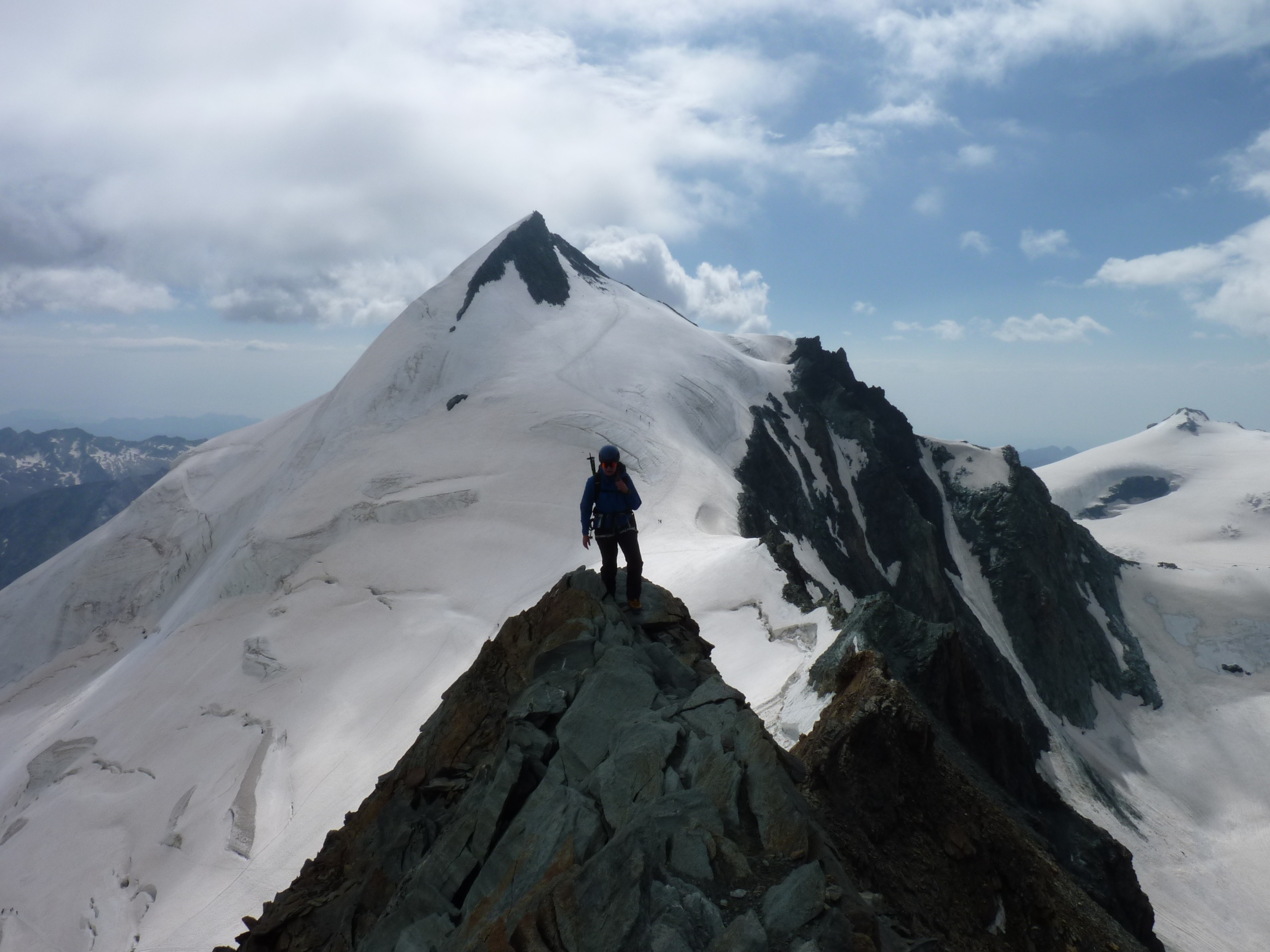 Ráno se převalují nad Saastalem mraky a skrz ně kýčovitě prosvítá slunko. Vítr se utišil a semotamo mrak nekazí dojem z nadcházejícího dne. Výživná snídaně, pobalit, obléct a vypadnout ven. Holky akorát vstávají, očividně ale se sbírají o hodně víc těžce, než my. Po čase z hřebenu vidíme, jak peláší nejkratší cestou z jochu po ledovci dolů do Täsche…