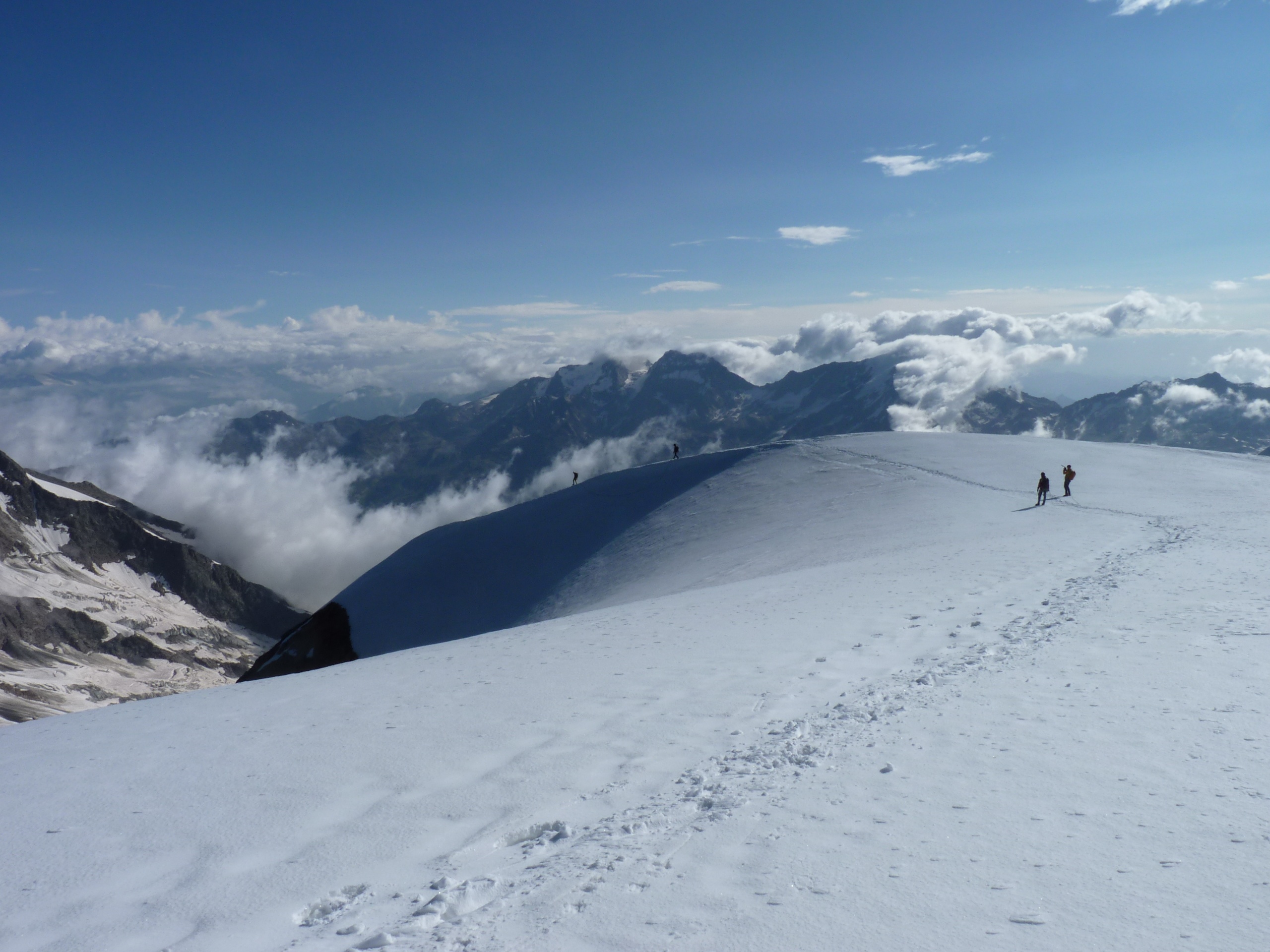 Ťapeme po placatém ledovci před Alphubelem. Potkáváme ty, kteří už byli nahoře. A zároveň s nelibostí pozorujeme mrak uchycený za kříž na vrcholu. Do údolí Saastal splouvají peřiny, houstnou a tmavnou (mezi námi a dnem údolí je 2000 vertikálním metrů). Koukáme, jak příroda vaří pod námi bouřku a dunění hromu se vrací od okolních štítů. Narychlo opakuji všem, co dělat, když by se to zvedlo a lízlo nás to. Co s kovovými věcmi, co se sebou. Zatím na nás svítí slunce, dole vře kotlík mračen. Klukům to se to moc nepozdává, Jana také nemá výraz, který by svědčil o pohodě. Cesta nazpět je dlouhá, ústupová varianta je kousek před námi, kde se dá sejít po ledovci Feegletsher ke stanici lanovky Längfluh. Je to sice 1000 výškových, ledovec je ale hodně pokrytý sněhem ze zimy a snad v dobré podmínce.