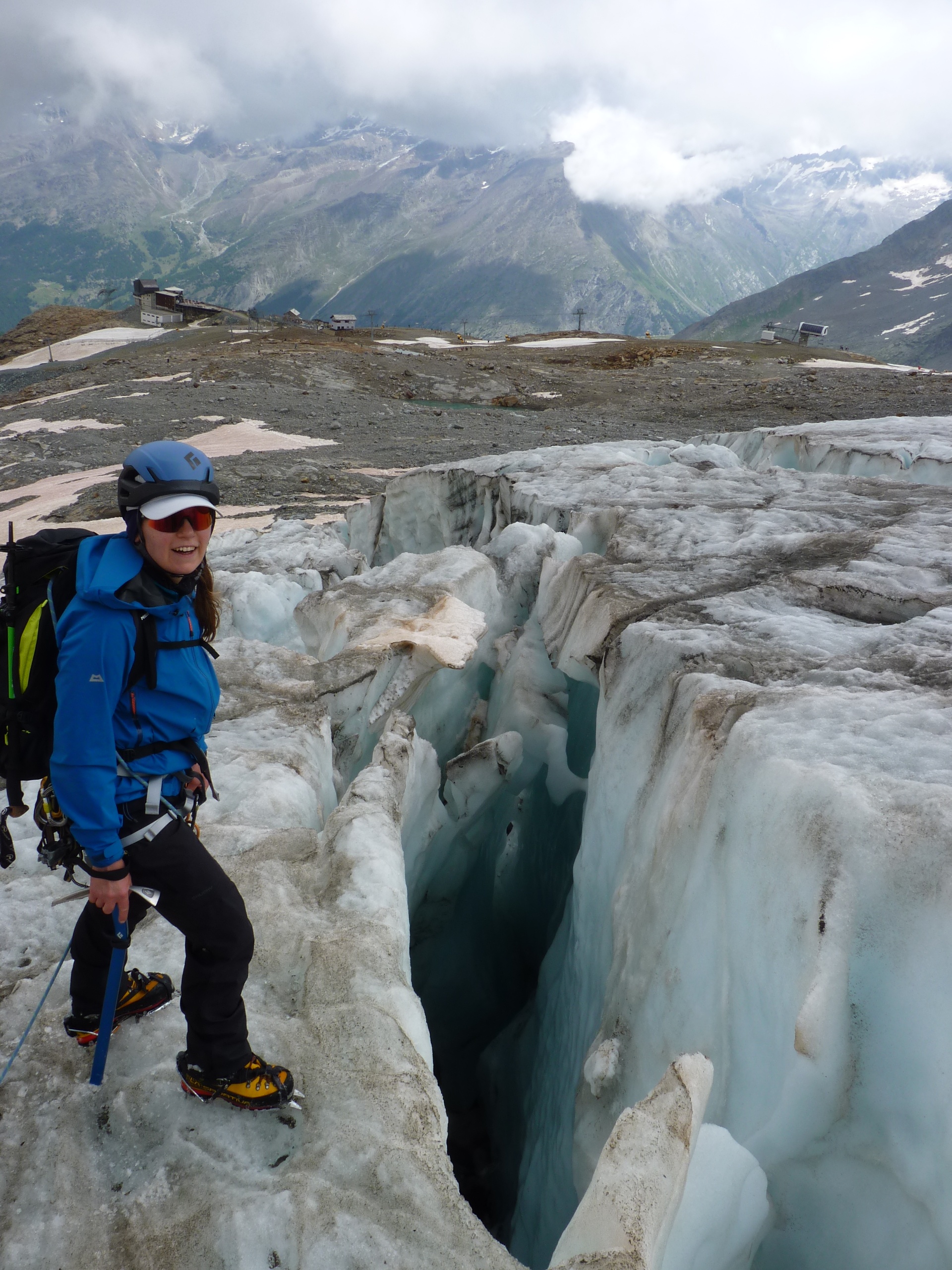 Sestup je dlouhý, ledovec členitý a každým metrem dolů je více a více vedro. Jana pěkně prošlápla jeden mostík, ale vše se obešlo bez problémů. Vyšlapaná pěšina ale náhle končí u trhliny zvící velikosti menší Macochy, je třeba se trošku vrátit a hledat svou vlastní cestu. Sem tam bylo lepší to dojistit přes zašlápnutý cepín, protože některé mostky vypadaly opravdu velmi křehce…