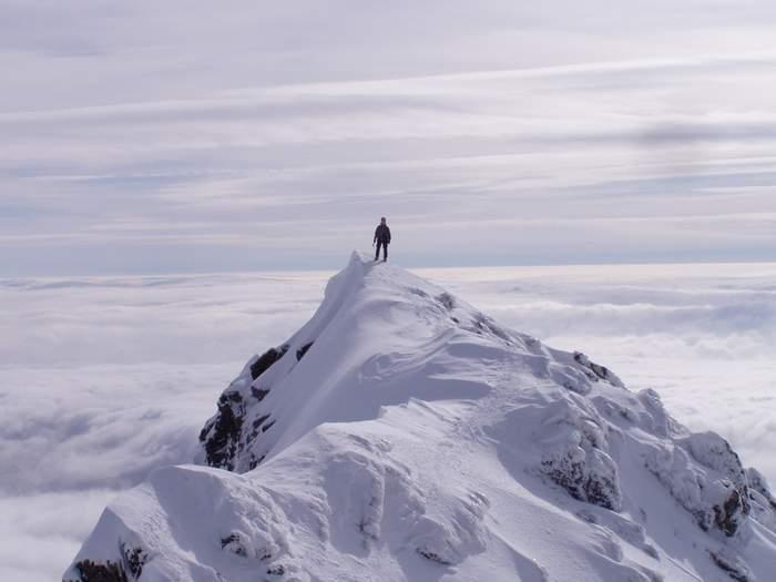 Příští den jsme s Honzou Weinzettelem využili přetrvávající přízně počasí i prošláplé stopy a po hrotech maček jsme vyrazili na Lomničák. Na Jordánově štrbině jsme byli za hodinku, obešli jsme Poslední vežu a potom to začalo být zajímavé. Od Lomnické věžičky jsme traverzovali doleva a brzo jsme byli donuceni zaštandovat. Terén byl celý zmrzlý, na skále půlcentimetrová glazura. První délku jsem natáhl moc doprava na hřebínek, takže ve druhé Honza traverzoval doleva, až jsme se octli přímo ve žlábku ve spádnici pod řetězy. Teď k nim jenom dolézt. Žlábek byl celý vyledněný a ze začátku příjemně pevný a ukloněný. Postupně se ale materiál horšil. Na povrchu ocelová krusta, pod ní cukr krystal až na skálu. První jištění jsem založil již po 15-ti metrech a po dalších 15-ti metrech jsem dolezl na konec žlábku pod vklíněný kámen. Třeba je pod ním skalní okno! Nebylo. Teď začalo to správné žrádlo! Musel jsem udělat pár kroků doleva na skleněné skály, kristepane ale jak, nepadat, klid, stojíš dobře, zajistit, sakra ale za co, nic tu není! Cepínem jsem kolem sebe mlátil tak dlouho, dokud jsme si ze skály nevykutal skalní hrot. Držel by? To se naštěstí nikdy nedozvím. O pár minut později jsem v obou rukou pevně svíral tlustý železný řetěz a hluboce se vydýchával. Lomničák padl ve 13:44, několik vrcholových foto a půl hodinky později sestupujeme.