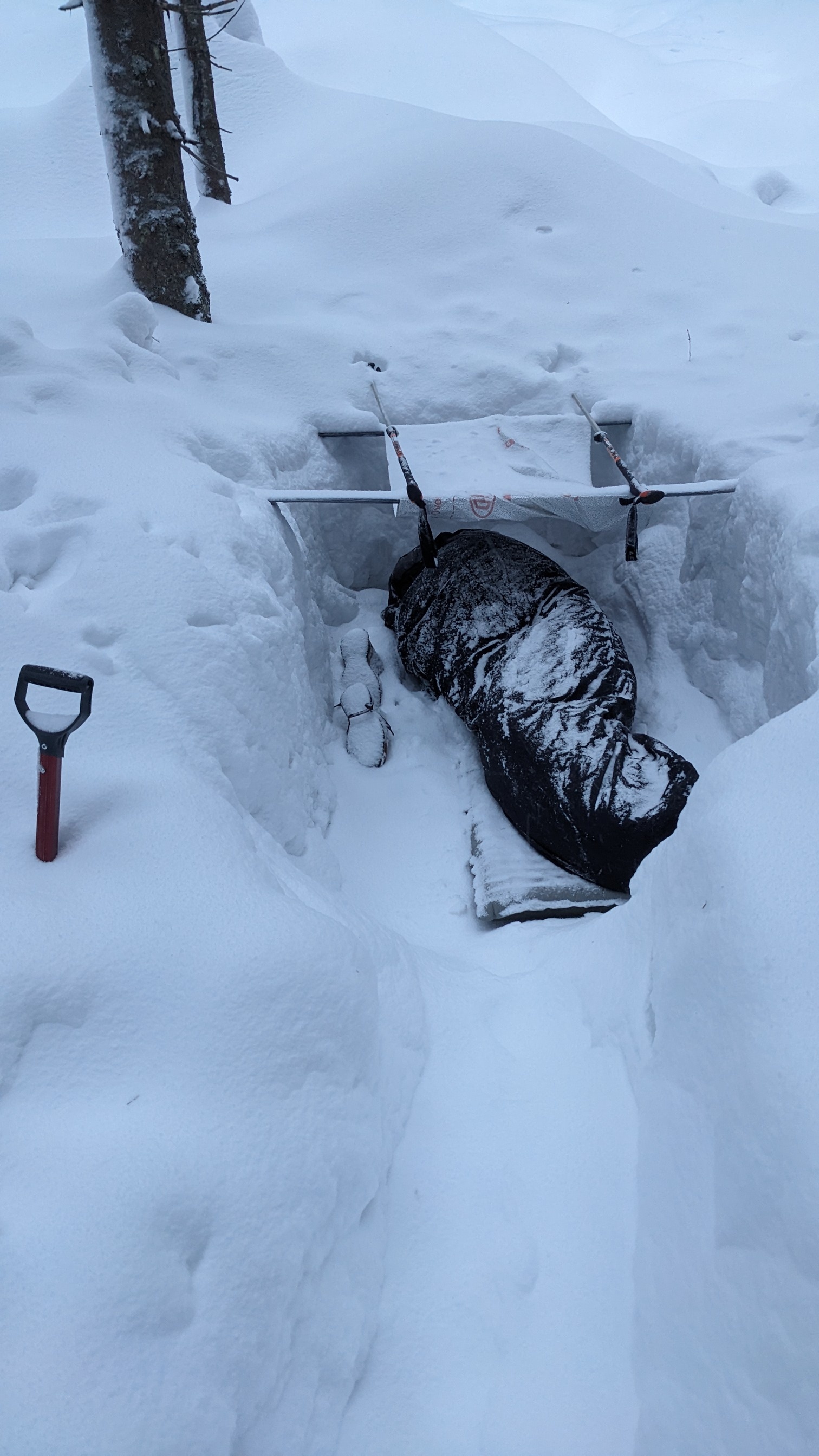 Celkově z toho mám dobrý pocit. Musím přiznat, že jsem si záhrab vykopala relativně krátký, takže mi nohy trochu trčely do vykopané cestičky, ale vydrželo to přes noc. Bylo to trochu stísněné až klaustrofobické, ale za celou noc jsem se probudila jenom jednou, když jsem sjela z karimatky. Nebyl to můj nejhorší spánek, ani nejlepší. Ráno mě probudil budík, a to až v 7:20. Začala jsem trochu panikařit, protože půjčené lyže jsem musela vrátit mezi sedmou a osmou. Rozebrala jsem to dost rychle.