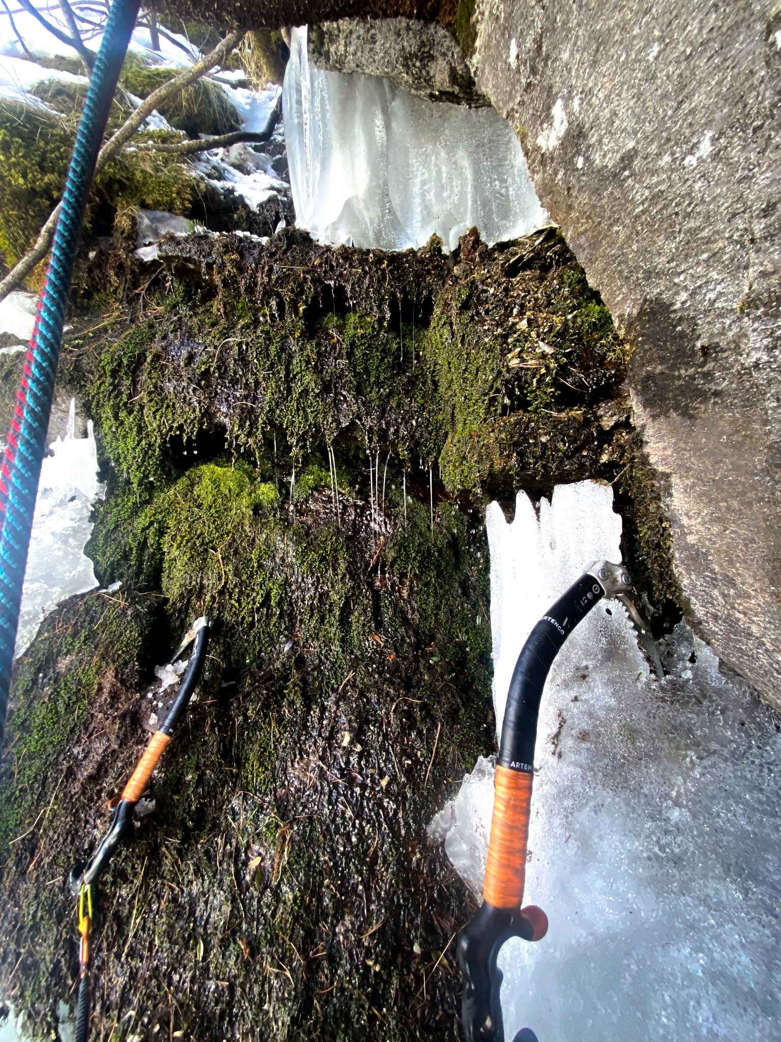 Budík ještě dřív než předešlé dny, opět máme pomalejší ráno o 30 min oproti plánu. Oba po vstanutí z postele sotva chodíme, jak nás tahají lýtka. Balíme a v plánu máme Amertaler WI 4 až 5, led je oproti ostatním o dost výš, okolo 2 000 m.n.m., jelikož se má oteplovat, tak se to hodí. Led lezl nedávno Kovi a psal "hezký kolmý led", tak se smějeme, že když Kovi psal "kolmý", tak to pro nás bude převislý :D. Pod ledem, ale zjišťujeme, že už tam je jedna dvojka a jedna trojka, tak volíme ledy vedle, které jsou lehčí, ale také pěkné. Začínám tahat, ale u třetího šroubu už nejsem schopný stát na nohách ani se držet rukama, chvíli sedím v šroubu, zkouším to znovu, ale cyklím se a opět návrat k šroubu a pokus, ale nikam to nevede a pouštím dopředu Tomáše, ten může i když už nemůže, takže to v klidu vyběhne a pak pokračujeme ještě traverzem pod další led, jelikož Tomáš chce lézt, i když už nechce :D dávám ještě ten, který je zakončený výlezem v potoce, po stromech a v bahně, pak už jen slanění a cesta domů.