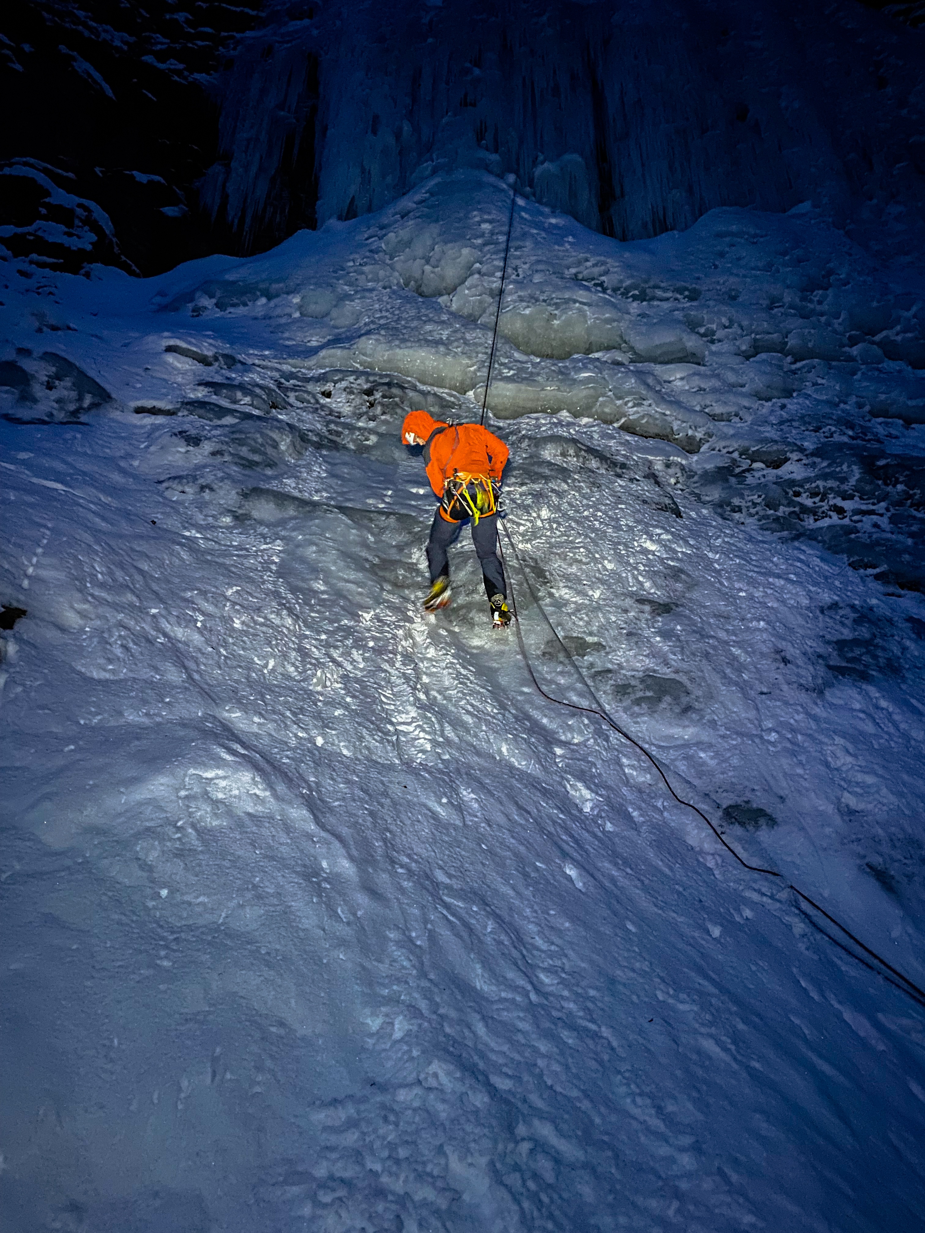 Budík ještě dřív než předešlé dny, opět máme pomalejší ráno o 30 min oproti plánu. Oba po vstanutí z postele sotva chodíme, jak nás tahají lýtka. Balíme a v plánu máme Amertaler WI 4 až 5, led je oproti ostatním o dost výš, okolo 2 000 m.n.m., jelikož se má oteplovat, tak se to hodí. Led lezl nedávno Kovi a psal "hezký kolmý led", tak se smějeme, že když Kovi psal "kolmý", tak to pro nás bude převislý :D. Pod ledem, ale zjišťujeme, že už tam je jedna dvojka a jedna trojka, tak volíme ledy vedle, které jsou lehčí, ale také pěkné. Začínám tahat, ale u třetího šroubu už nejsem schopný stát na nohách ani se držet rukama, chvíli sedím v šroubu, zkouším to znovu, ale cyklím se a opět návrat k šroubu a pokus, ale nikam to nevede a pouštím dopředu Tomáše, ten může i když už nemůže, takže to v klidu vyběhne a pak pokračujeme ještě traverzem pod další led, jelikož Tomáš chce lézt, i když už nechce :D dávám ještě ten, který je zakončený výlezem v potoce, po stromech a v bahně, pak už jen slanění a cesta domů.