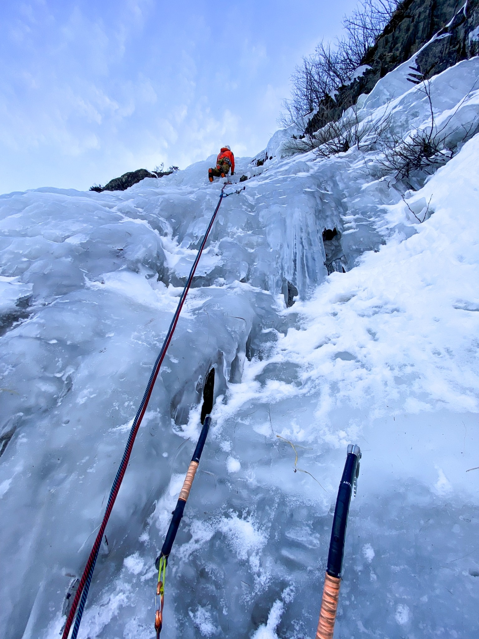 Budík ještě dřív než předešlé dny, opět máme pomalejší ráno o 30 min oproti plánu. Oba po vstanutí z postele sotva chodíme, jak nás tahají lýtka. Balíme a v plánu máme Amertaler WI 4 až 5, led je oproti ostatním o dost výš, okolo 2 000 m.n.m., jelikož se má oteplovat, tak se to hodí. Led lezl nedávno Kovi a psal "hezký kolmý led", tak se smějeme, že když Kovi psal "kolmý", tak to pro nás bude převislý :D. Pod ledem, ale zjišťujeme, že už tam je jedna dvojka a jedna trojka, tak volíme ledy vedle, které jsou lehčí, ale také pěkné. Začínám tahat, ale u třetího šroubu už nejsem schopný stát na nohách ani se držet rukama, chvíli sedím v šroubu, zkouším to znovu, ale cyklím se a opět návrat k šroubu a pokus, ale nikam to nevede a pouštím dopředu Tomáše, ten může i když už nemůže, takže to v klidu vyběhne a pak pokračujeme ještě traverzem pod další led, jelikož Tomáš chce lézt, i když už nechce :D dávám ještě ten, který je zakončený výlezem v potoce, po stromech a v bahně, pak už jen slanění a cesta domů.