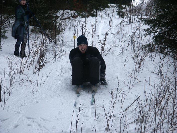 I když se Lukáš bál, že ho budeme lynčovat, protože až do Polesí nebyla po sněhu téměř žádná památka, nakonec se přece jen něco našlo, na čem se dalo lyžovat. I když kvalita sněhu nebyla příliš valná, výlet se vcelku vydařil a místo zuřivého sportování jsme podnikli spíše vlastivědný výlet do blízkého pohraničí, prohlédli si několik zajímavých skal s různými klasickými cestami, ze kterých se alespoň mně zvedal žaludek....ale KT by si určitě liboval. Taky jsme dali několik zajímavých sjezdů, z nichž některé skončily, jak jsem už psala, modřinou velikosti 2 CD (Elvis), nebo placákem a naraženým břichem a krkem (Evuša). Tady je pár fotek od Pojídače a hlavně hyeny Elvise, který místo aby mě po pádu křísil a zachraňoval, tak to všechno fotil. Inu, reportér SDN se nezapře... Senzace především. Takže můžete sami porovnat nejrůznější jezdecké styly účastníků výpravy...