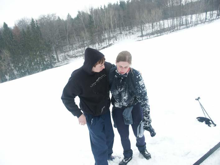 I když se Lukáš bál, že ho budeme lynčovat, protože až do Polesí nebyla po sněhu téměř žádná památka, nakonec se přece jen něco našlo, na čem se dalo lyžovat. I když kvalita sněhu nebyla příliš valná, výlet se vcelku vydařil a místo zuřivého sportování jsme podnikli spíše vlastivědný výlet do blízkého pohraničí, prohlédli si několik zajímavých skal s různými klasickými cestami, ze kterých se alespoň mně zvedal žaludek....ale KT by si určitě liboval. Taky jsme dali několik zajímavých sjezdů, z nichž některé skončily, jak jsem už psala, modřinou velikosti 2 CD (Elvis), nebo placákem a naraženým břichem a krkem (Evuša). Tady je pár fotek od Pojídače a hlavně hyeny Elvise, který místo aby mě po pádu křísil a zachraňoval, tak to všechno fotil. Inu, reportér SDN se nezapře... Senzace především. Takže můžete sami porovnat nejrůznější jezdecké styly účastníků výpravy...