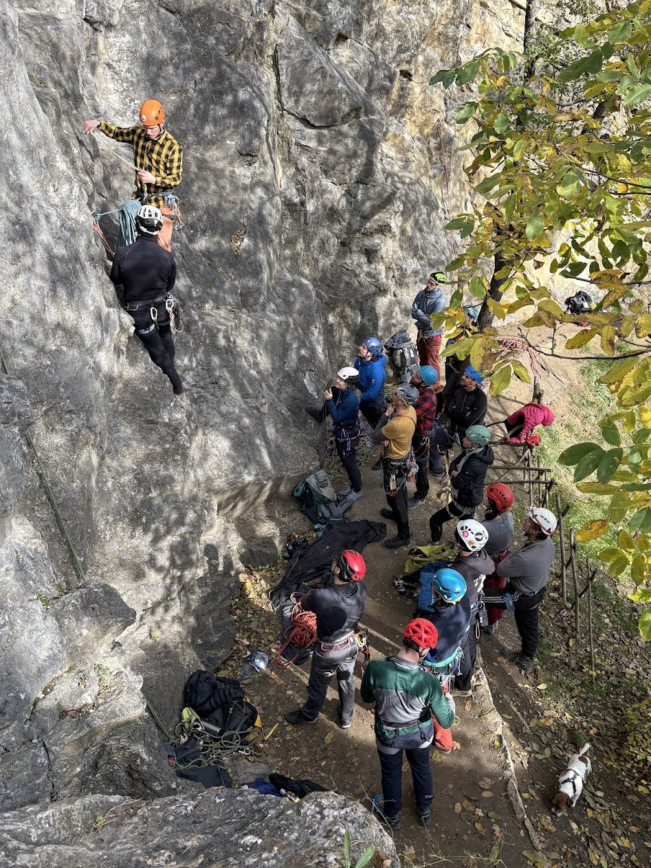 Pod skalou Jiří, neboli vedoucí zájezdu pro dnešní den, velí nasadit helmy, navléknout sedáky, a jdeme na to. Začínáme s tématem expresek, jaké jsou druhy, na co si dát pozor, jak cvakat, jak necvakat. K tomu je přidána kapitola, jak zřídit a zrušit vratný bod. Ještě na zemi opakujeme veledůležitý partnercheck, a také, jak zakravit půlloďák i kýbl. A hned se vrháme do praxe si vše vyzkoušet.
