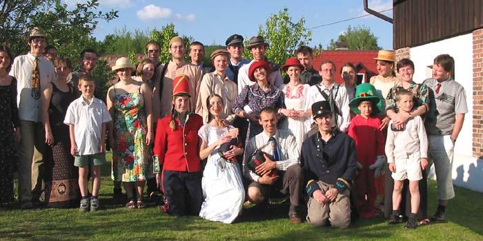 Po předání darů novomanželům včetně celohumanitního leporelo-fotoalba se přežraní hosté vrhli na sportovní hrátky - jízdu na lehacím a tandemovém kole, ping pong a volejbal s týmy deset na deset. Jen co zapadlo slunce za obzor a míč už nebyl vidět, naladil oddílový maestro Hrb kytaru a spustil své vypalovačky. Ohýnek pěkně hřál, pivo teklo proudem a tak někteří jedinci vydrželi až do časných raních hodin. Jelikož se veselice neúčastnil ani Čuňas ani Buřt, zůstal pivní rekord na devíti půlitrech. Gratulujeme rekordmanovi!!!