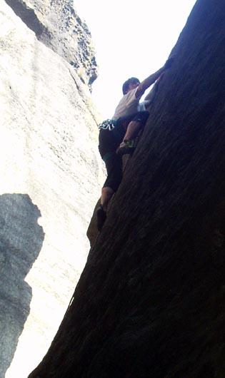 Ačkoliv šla většina lidí spát poměrně brzy, ráno se všichni váleli a moje hrůzné očekávání, že nás Lukáš začne v osm tahat ze spacáků, se nenaplnilo. Dokonce se válel déle než Tok a přiznal, že nam tom mrcasení něco je. I přes značnou opotřebovanost prstů a občasné dešťové přeháňky jsme nakonec vylezli asi pět nebo šest cest včetně výživného sedmičkového traverzu (který by si určitě zasloužil nějaké písmenko navíc) a vraždy VIIIc, kterou všichni oprasili co to dalo. Brto i Tok se nakonec vzmátožili a také začli lízt, přičemž Tok vytáhl jednu celkem nepříjemnou šestku.