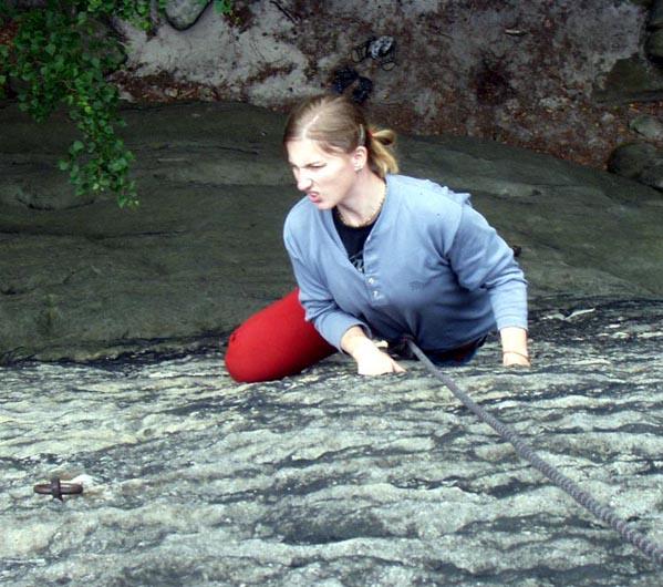 Ačkoliv šla většina lidí spát poměrně brzy, ráno se všichni váleli a moje hrůzné očekávání, že nás Lukáš začne v osm tahat ze spacáků, se nenaplnilo. Dokonce se válel déle než Tok a přiznal, že nam tom mrcasení něco je. I přes značnou opotřebovanost prstů a občasné dešťové přeháňky jsme nakonec vylezli asi pět nebo šest cest včetně výživného sedmičkového traverzu (který by si určitě zasloužil nějaké písmenko navíc) a vraždy VIIIc, kterou všichni oprasili co to dalo. Brto i Tok se nakonec vzmátožili a také začli lízt, přičemž Tok vytáhl jednu celkem nepříjemnou šestku.