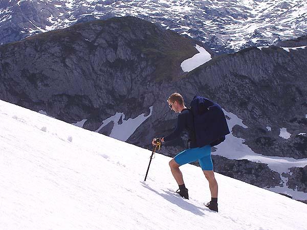 Večer se sice trochu honili mraky, ale úterní ráno bylo opět nádherně. Vrazili jsme na Niederes Grosswandeck s cílem vylézt Fingerkante. Nástupový komín byl ale mokrý a z části ještě vyplněn sněhem. Změnili jsme tedy cestu na JV hřeben 3+, neměli jsme sice nákres ani popis, ale cesta byla vybavena nýty, které nás vedly až na vrchol. Sestup byl tentokrát trochu dobrodružnější. Po návratu jsme šli na chatu na večeři. Paní Steinerová se opět ptala Martina kde jsme byli a on opět nevěděl. Při výběru jídla jsme museli spoléhat na Kubovu a Martinovu němčinu. Oba dva si vybrali jakýsi sýr, jaké bylo jejich překvapení, když dostali opečený luncheon.