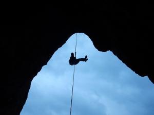 Od Kříže slaníme do obrovské jeskyně 30 metrů vzduchem.