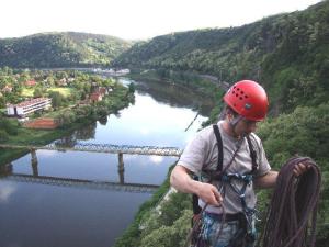 Vybavení Jako na každé jiné skály, určitě to chce vklíněnce, smyčky atd., fixního jištění je ve skále málo a když, tak už řádně orezlého. Bez helmy leze v Řeži jen sebevrah.