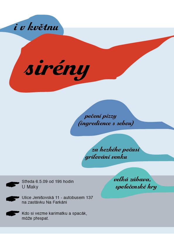 Znakem květnových Sirén bude pořádná pečínka v místech archaických, kde ze stěn i ze zahrady dýchnou vzpomínky na někdejší nájemníky - velkého metodika Goba a jeho družky. Hlavním programem bude grilovačka typu Co kdo přinese, meze se nekladou ničemu, kdoví jestli mezi členy Humanity nedřímá nějaký býložravec, či naopak dokonce kanibal. Aby nebyla porušena tradice, ať každý přinese pití, které mu chutná a k masu náleží. Komu i to je málo, nalákají ho snad hry, veselí a oddíloví přátelé.